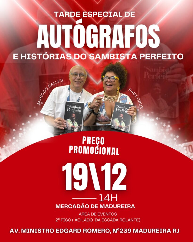 Desta vez, a tarde de autógrafos da biografia “Sambista Perfeito”, chega à Zona Oeste, no famoso e tradicional, Mercadão de Madureira, no dia 19 de dezembro, às 19h, com entrada gratuita. O evento contará com um bate-papo descontraído entre Marcos Sallese Babi Cruz.