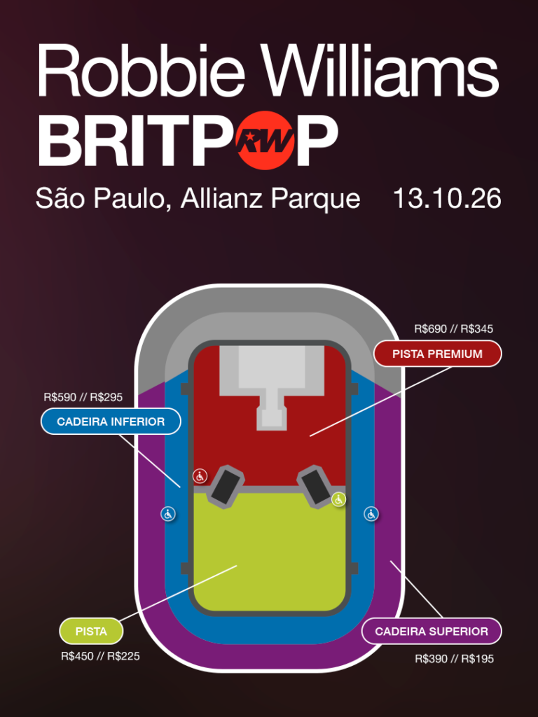 Começou na última quinta-feira, dia 09/04, a partir do meio-dia, a venda de ingressos para o único show de Robbie Williams no Brasil. O artista apresenta sua turnê BRITPOP no dia 13 de outubro em São Paulo, no AllianzParque. Essa turnê teve início em maio de 2025 em Edimburgo, na Escócia, e já passou por 24 países, chegando à marca de 1,2 milhão de público. Esse ano estão confirmados shows na Europa, África, América Central, América do Sul e Oceania. Ofechamento será em novembro, na Nova Zelândia.