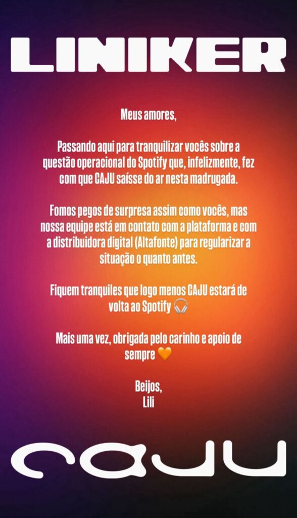 “Fomos pegos de surpresa assim como vocês, mas nossa equipe está em contato com a plataforma e com a distribuidora digital para regularizar a situação o quanto antes. Fiquem tranquiles que logo menos Caju estará de volta ao Spotify. Mais uma vez, obrigada pelo carinho e apoio de sempre. Beijos, Lili”, escreveu.