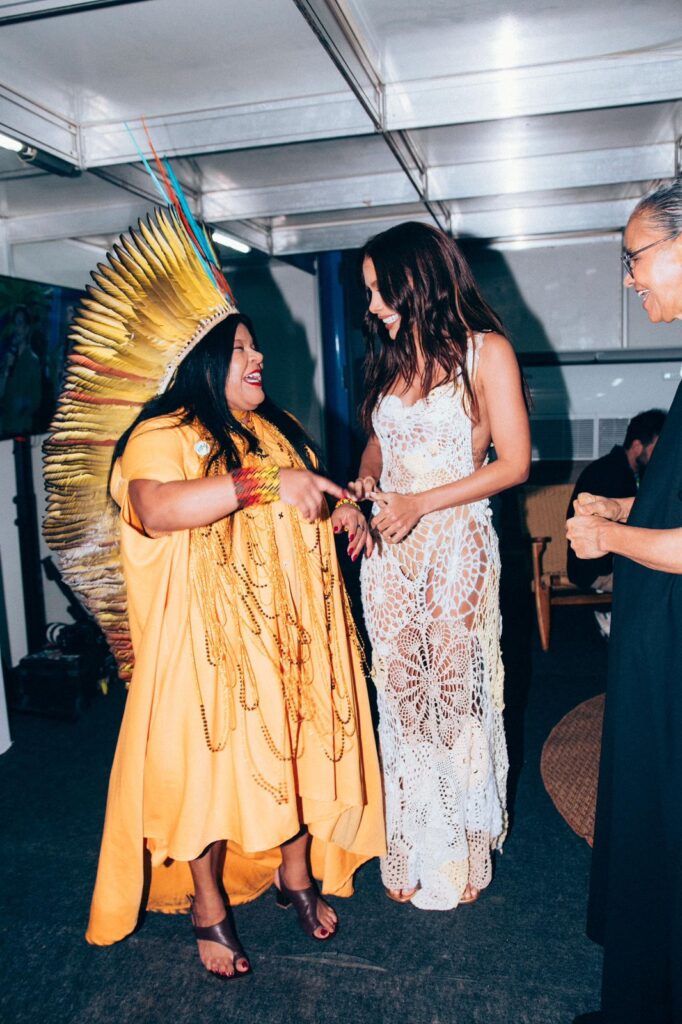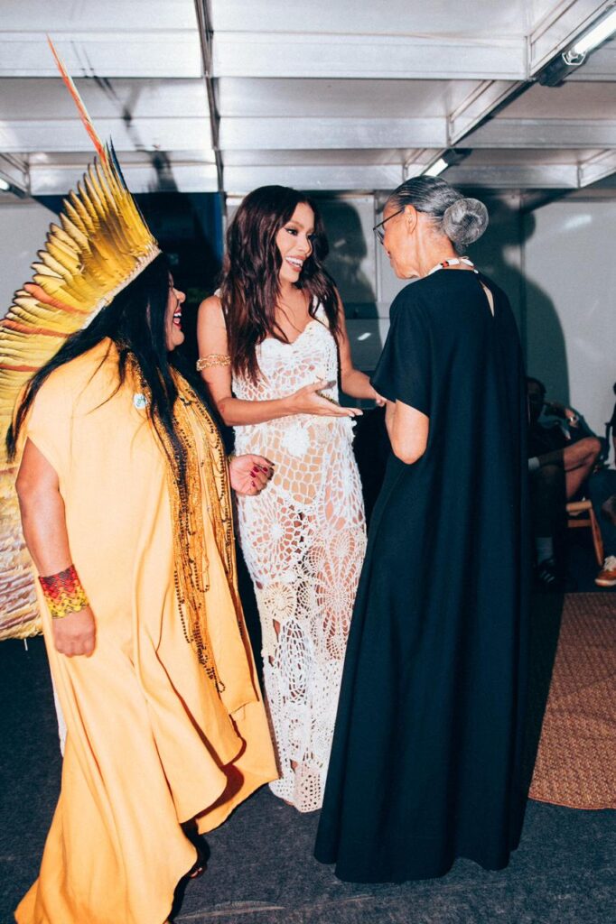 Pouco antes do momento no palco, Anitta havia recebido em seu camarim as ministras Marina Silva, titular do Meio Ambiente e Mudança do Clima, e Sônia Guajajara, ministra dos Povos Indígenas — a primeira mulher indígena a ocupar um cargo de primeiro escalão no governo federal brasileiro.