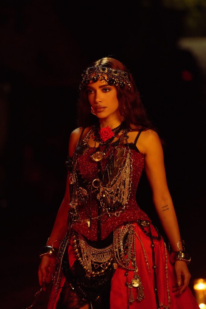 A transição é radical: do chorinho vintage, a música mergulha fundo na energia da Pombagira. “Cruzou sete encruzilhadas / Só pra me encontrar / Me deu sete saias pra me impressionar”, ela canta, trazendo referências às sete saias, às sete encruzilhadas e aos agrados feitos aos exus, elementos da umbanda reinterpretados com olhar pop e dançante. “É uma homenagem à minha Pombagira, à Carmen Miranda. Tem todo esse poder e essa potência, mas sempre com respeito e de uma maneira pop”, define Anitta.