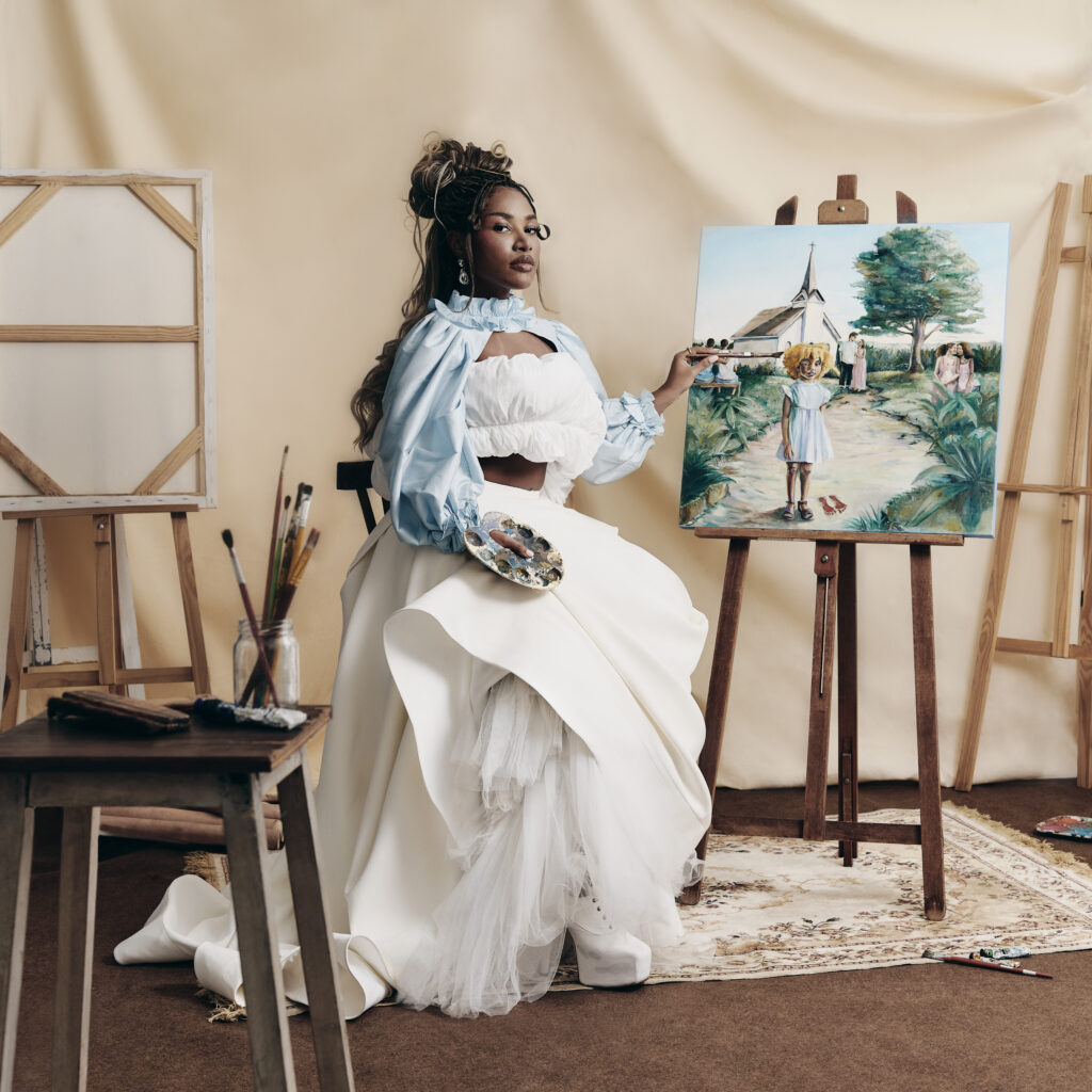 Para a Ebony, sua versão adulta pincelando o quadro com ela ainda criança também retrata imageticamente o que o novo KM2 simboliza. “Eu brinco dizendo que o primeiro álbum foi feito pela Milena, mas a Ebony fez o (De Luxo). Porque definitivamente foi polido; parece, de fato, uma obra finalizada agora”, comemora.