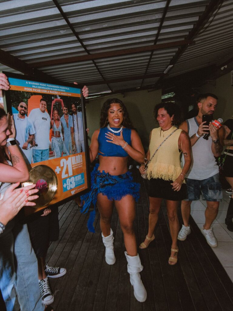 Neste domingo (26), na Ilha Itanhangá, no Rio de Janeiro, a cantora Marvvila foi o grande destaque da festa de sua label “Só VVamo”. Durante o evento, a artista recebeu oficialmente o certificado de ouro pela música “Pode Ficar com a Razão”, parceria com o grupo Menos é Mais, em reconhecimento ao expressivo desempenho da faixa nas plataformas digitais.