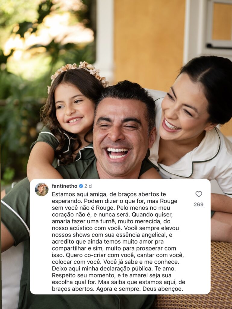 “Estamos aqui amiga, de braços abertos te esperando. Podem dizer o que for, mas Rouge sem você não é Rouge. Pelo menos no meu coração não é, e nunca será. Quando quiser, amaria fazer uma turnê, muito merecida, do nosso acústico com você. Você sempre elevou nossos shows com sua essência angelical, e acredito que ainda temos muito amor pra compartilhar e sim, muito para prosperar com isso. Quero co-criar com você, cantar com você, colocar com você. Você já sabe e me conhece. Deixo aqui minha declaração pública. Te amo. Respeito seu momento, e te amarei seja sua escolha qual for. Mas saiba que estamos aqui, de braços abertos. Agora e sempre. Deus abençoe.”
