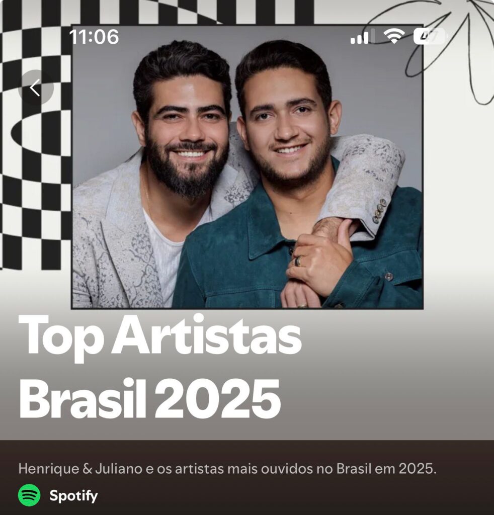 Henrique & Juliano se consolidam como um dos maiores nomes da música sertaneja, pelo segundo ano consecutivo a dupla emplacou o “Manifesto Musical 2” como o álbum mais ouvido do Spotify, além de adicionarem “O Céu Explica Tudo” e “To Be” entre os cinco mais ouvidos. Tal feito, levou a dupla a alcançar a liderança do ranking de artistas mais ouvidos do Spotify Brasil em 2025.