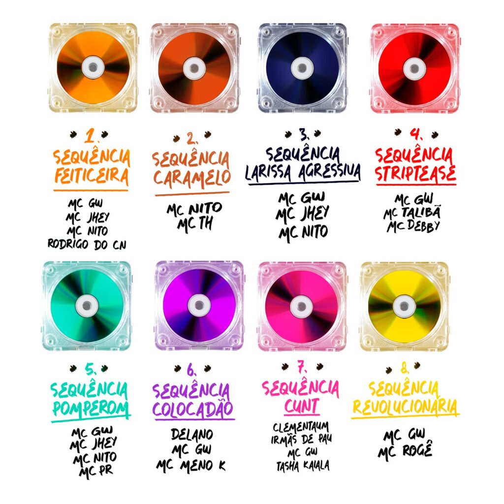 O disco também inclui faixas já conhecidas pelo público, como as sequências “Striptease” — um dos hits do Carnaval 2025 —, “Colocadão” e “Revolucionária”. Outro destaque é o hit internacional “Sequência Feiticeira”, que segue entre as cinco músicas mais ouvidas no Brasil e em Portugal, além de ter alcançado o Top 20 Global no Spotify.