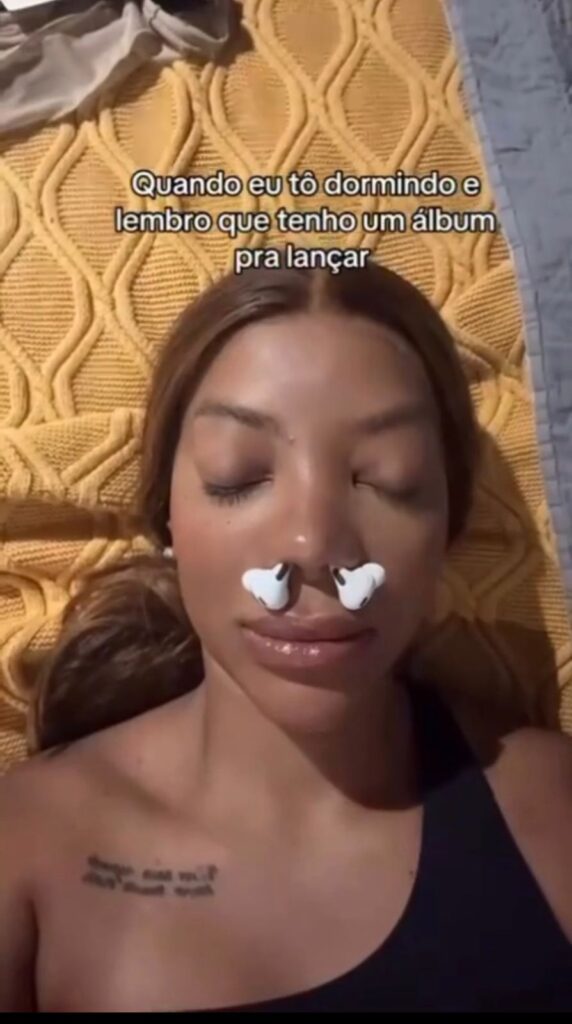 Em vez de ignorar o burburinho, Ludmilla e sua equipe decidiram embarcar na brincadeira. No perfil da equipe da cantora, o vídeo foi recriado de forma descontraída: desta vez, a cantora surge com fones de ouvido no nariz e a legenda “Quando eu tô dormindo e lembro que tenho um álbum pra lançar”.