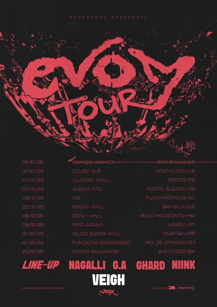 Um dos principais nomes do rap nacional, Veigh estreia a sua mais nova turnê, EVOM Tour, no dia 25 de outubro, no Espaço Unimed, em São Paulo. O artista, que ultrapassa 22 milhões de ouvintes mensais nas plataformas de áudio e integrou a lista Forbes Under 30 de 2024, apresenta ao vivo o recém-lançado álbum Eu Venci o Mundo (2025), figurado no Top 3 Global do Spotify. Realizado pela 30e, maior companhia brasileira de entretenimento ao vivo, em parceria com Supernova Ent.